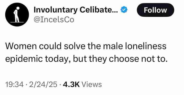 Men are not lonely; they are insufferable and entitled, fueled by toxic masculinity to perform to be these “alphas” when, in fact, behind closed doors, they are submissive and breedable, as the saying goes. When will men learn that the effort they are making is failing and only harming their chances of finding a soul mate? Fifty-five percent of men voted for Donald Trump, according to Pew Research in the 2024 analysis of voting trends, and they wonder why women do not even want to touch them. The entitlement to women’s bodies as they treat women like incubators for their offspring to raise their children to be ignorant and follow unthinkingly, but sure let them be alphas. When they focus on physical aspects of a woman’s body, they are fetishizing, and it’s even worse for communities that are asian, black, and trans. The simple answer is that men are undatable, and it is entirely their fault.