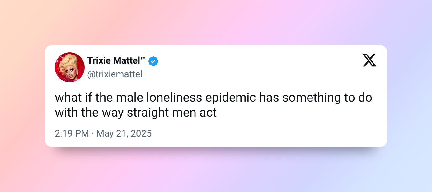 Straight men perpetuate this rhetoric as if they are not the cause of it. In the grand scheme of things, many may not feel hopeful about change, and I echo those sentiments: so, when will the status quo change? ALL OF THIS TO SAY, MEN SHOULD BE LONLIER AND SIT WITH THEIR ACTIONS!